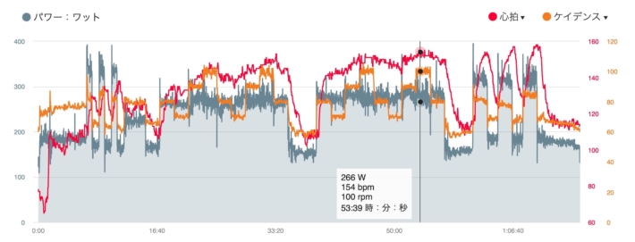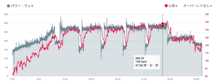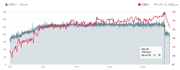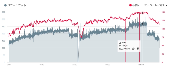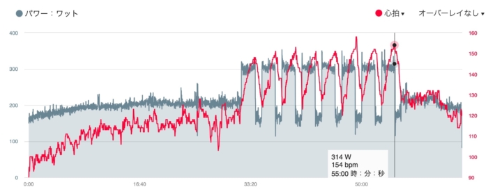 わりと来て追い打ち。脚はとくに軽くもないができそうだったので300W目安で2分。明日に備えて腹8分目で。