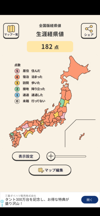 伊勢からの帰りは途中でメシを食ったのを除くと5時間ちょっとで帰ってきた。思ったより早く帰ったので資材搬出と搬入までしておいた。今回の旅ではとくに自分に感じる神秘体験はなかったが、健太郎の感覚では多少あったらしい。和歌山に宿泊したので経県値マップを更新。